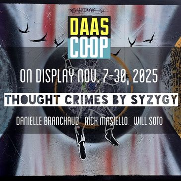 DAAS CO-OP Art Gallery & Gifts is showcasing the artwork of the Syzygy collaborative; Danielle Branchaud, Nick Masiello, Will Soto. The opening reception for this exhibition entitled Thought Crimes is scheduled for the evening of Friday, November 7, 2025, from 5:30pm to 9:00pm. The exhibition will be on display until November 30, 2025.
